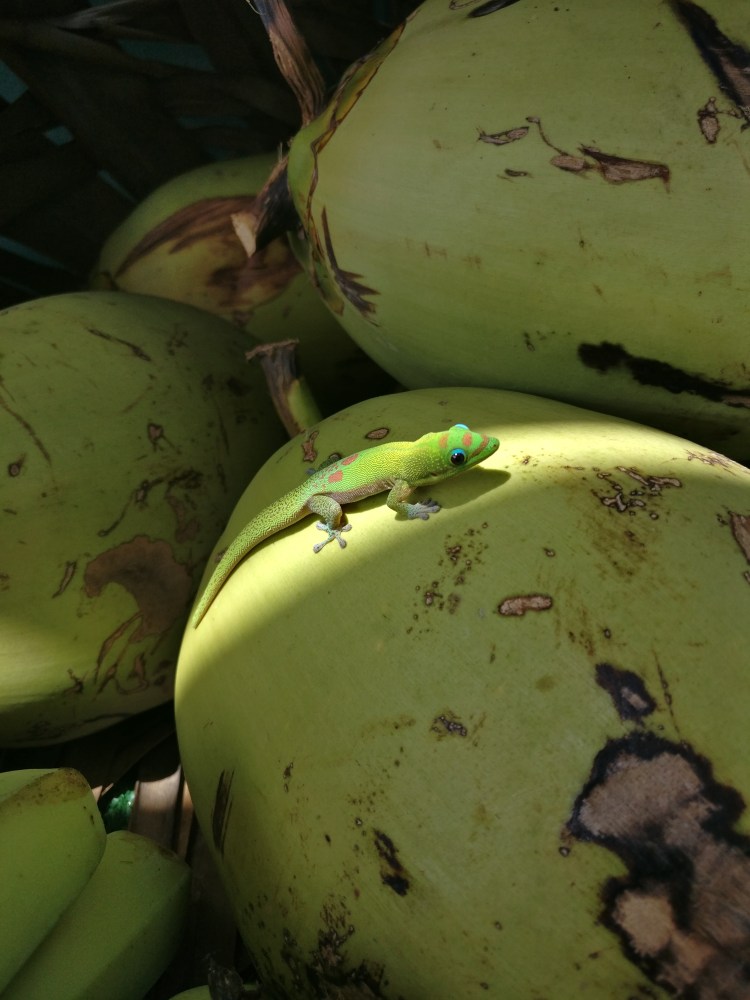 Wer die Augen gut aufhält, kann knallig grüne Geckos entdecken.